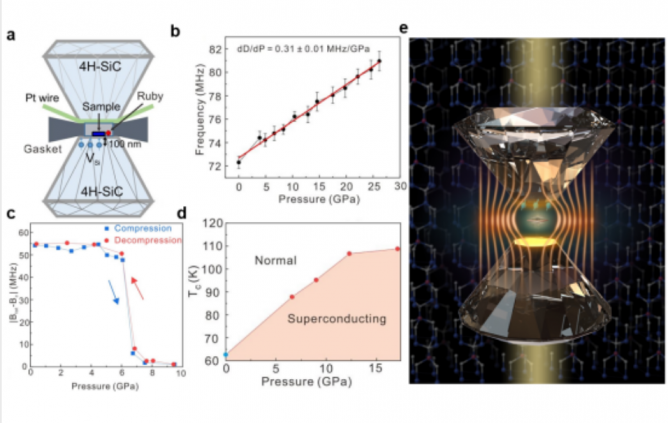 實(shí)驗(yàn)結(jié)果和示意圖。圖a碳化硅對(duì)頂砧和淺層硅空位色心探測(cè)磁性樣品示意圖;b硅空位色心零場(chǎng)劈裂隨壓力的變化關(guān)系;c釹鐵硼材料的磁性相變探測(cè);d釔鋇銅氧超導(dǎo)材料的Tc-P相圖;e基于碳化硅中硅色心實(shí)現(xiàn)高壓原位磁探測(cè)的示意圖。