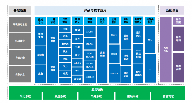 基礎(chǔ)通用:基于汽車行業(yè)對芯片的可靠性、運行穩(wěn)定性和安全性等應(yīng)用需求,提取出汽車芯片共性通用要求,主要包括環(huán)境及可靠性、電磁兼容、功能安全和信息安全共4個基礎(chǔ)通用性能要求。