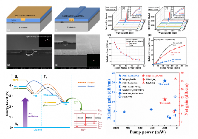 張丹教授與許輝教授的這項(xiàng)研究工作以噻吩基三氟甲基乙酰丙酮(TTA)為陰離子配體,以含有二苯基膦氧基團(tuán)的XPO為中性配體,合成了釹配合物Nd(TTA)3(XPO),通過有機(jī)配體與中心稀土釹離子的分子內(nèi)能量傳遞作用,實(shí)現(xiàn)了釹離子在兩個(gè)近紅外波長1.06 µm 和1.31 µm的高效發(fā)光;同時(shí),設(shè)計(jì)并制備了適合材料的掩埋條形和倏逝波型兩種結(jié)構(gòu)的硅基光波導(dǎo)器件,采用低功率發(fā)光二極管(LED)替代傳統(tǒng)的激光器作為泵浦源,在1.06 µm波長處實(shí)現(xiàn)了22.5 dB/cm的光增益,這是目前有機(jī)光波導(dǎo)放大器在該波長的最高增益報(bào)道;同時(shí),器件在1.31 µm波長處獲得了8.4dB/cm的光增益,這也是該類器件在光通信O波段實(shí)現(xiàn)高增益光放大的首次突破。