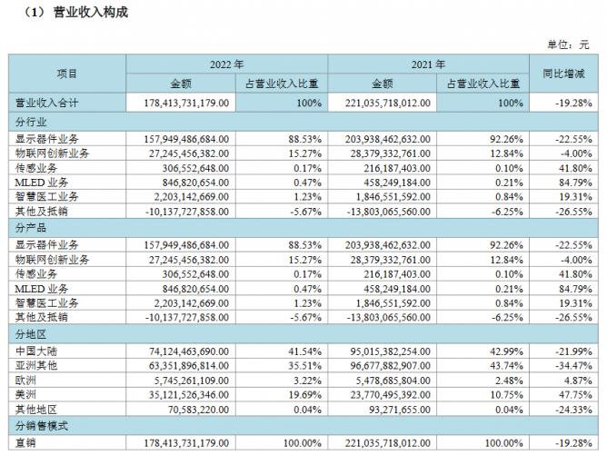 4月3日,京東方科技集團(tuán)股份有限公司(京東方A:000725;京東方B:200725)發(fā)布2022年年度報(bào)告,全年實(shí)現(xiàn)營(yíng)業(yè)收入1784.14億元,歸屬于上市公司股東的凈利潤(rùn)75.51億元。面對(duì)2022年全球經(jīng)濟(jì)低迷、消費(fèi)需求不振、顯示行業(yè)承壓等諸多挑戰(zhàn),BOE(京東方)總體表現(xiàn)可圈可點(diǎn),深刻踐行穩(wěn)健經(jīng)營(yíng)、精益管理,取得優(yōu)于行業(yè)的經(jīng)營(yíng)業(yè)績(jī)。BOE(京東方)以“屏之物聯(lián)”為發(fā)展戰(zhàn)略,以“堅(jiān)定從容、夯實(shí)內(nèi)功、長(zhǎng)期主義”為指導(dǎo)方針,“1+4+N+生態(tài)鏈”架構(gòu)取得長(zhǎng)足發(fā)展,其中物聯(lián)網(wǎng)創(chuàng)新中的系統(tǒng)方案、傳感、MLED、智慧醫(yī)工業(yè)務(wù)營(yíng)收分別增長(zhǎng)41.16%、41.80%、84.79%、19.31%,經(jīng)營(yíng)韌性持續(xù)提升。