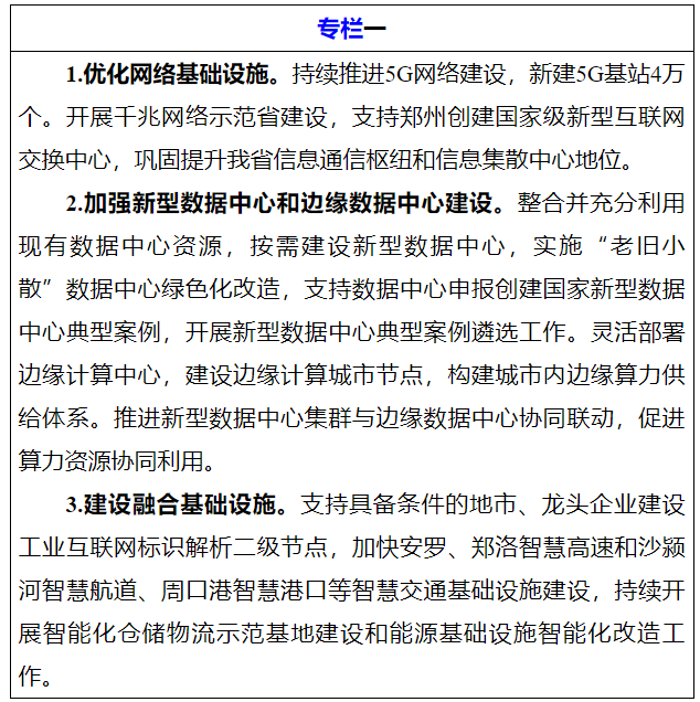 重點任務方面,完善數(shù)據(jù)基礎設施。優(yōu)化網(wǎng)絡基礎設施,加快5G網(wǎng)絡建設和萬兆光源網(wǎng)絡(10G-PON)部署。統(tǒng)籌推進數(shù)據(jù)中心建設,加快建設新型數(shù)據(jù)中心和邊緣計算中心。提升算力基礎設施,加快智能算力中心等項目建設,提升國家超算中心鄭州中心算力算網(wǎng),拓展特色應用,打造一批國內(nèi)領先的典型應用案例,構(gòu)建云網(wǎng)深度融合的中部算力中心。建設融合基礎設施,推進工業(yè)互聯(lián)網(wǎng)標識解析二級節(jié)點建設,加快交通、物流、能源等領域基礎設施智能化改造。