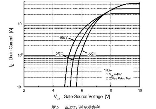 假定在導(dǎo)通時(shí),F(xiàn)ET電流上升到10A,根據(jù)圖3中25℃的那條曲線,為了達(dá)到10A的值,柵極電壓必須從5.2V轉(zhuǎn)換到6.7V,平均GFS為10A/(6.7V-5.2V)=6.7mΩ。