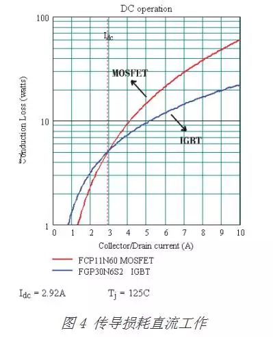在比較額定值為600V的器件時(shí),IGBT的傳導(dǎo)損耗一般比相同芯片大小的600 V MOSFET少。這種比較應(yīng)該是在集電極和漏極電流密度可明顯感測(cè),并在指明最差情況下的工作結(jié)溫下進(jìn)行的。例如,F(xiàn)GP20N6S2 SMPS2 IGBT 和 FCP11N60 SuperFET均具有1℃/W的RθJC值。圖4顯示了在125℃的結(jié)溫下傳導(dǎo)損耗與直流電流的關(guān)系,圖中曲線表明在直流電流大于2.92A后,MOSFET的傳導(dǎo)損耗更大。