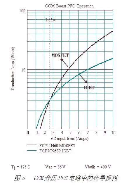 圖5中的示例僅考慮了CCM PFC電路的傳導(dǎo)損耗,即假定設(shè)計(jì)目標(biāo)在維持最差情況下的傳導(dǎo)損耗小于15W。以FCP11N60 MOSFET為例,該電路被限制在5.8A,而FGP20N6S2 IGBT可以在9.8A的交流輸入電流下工作。它可以傳導(dǎo)超過(guò)MOSFET 70% 的功率。