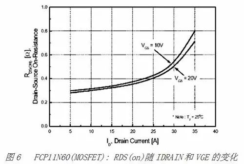 在MOSFET傳導(dǎo)極小占空比的高脈沖電流拓?fù)浣Y(jié)構(gòu)中,應(yīng)該考慮圖6所示的特性。如果FCP11N60 MOSFET工作在一個(gè)電路中,其漏極電流為占空比7.5%的20A脈沖 (即5.5A RMS),則有效的RDS(on)將比5.5A(規(guī)格書(shū)中的測(cè)試電流)時(shí)的0.32歐姆大25%。