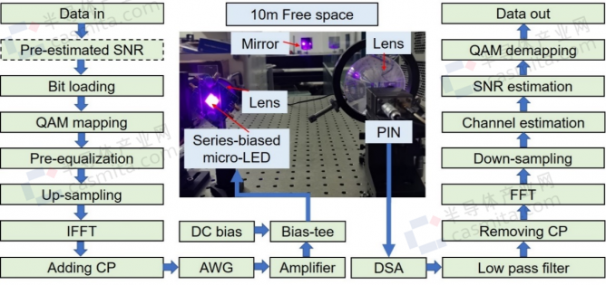 信號的發(fā)射源采用了串聯(lián)結(jié)構(gòu)的紫光Micro-LED,Micro-LED的尺寸為20微米,串聯(lián)結(jié)構(gòu)使發(fā)射的光功率高于3mW,該發(fā)射源綜合實(shí)現(xiàn)了高帶寬與高光功率的結(jié)合,十分有利于長距離下可見光通信的表現(xiàn)。信號采用了OFDM調(diào)制方式,以及采用比特加載技術(shù)合理的為子載波分配比特,提升頻譜效率的同時(shí)使誤碼率控制在門限值以下。該工作還使用了預(yù)均衡技術(shù)提升信號帶寬至2GHz,并且在不同的通信距離使用不同的均衡的參數(shù),使不同距離下的通信速率達(dá)到最高。