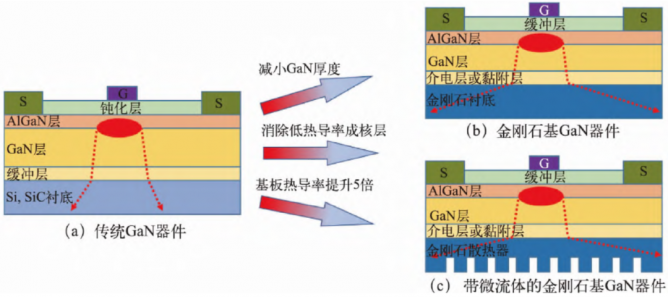使用 GaN 材料制備的高電子遷移率晶體管(HEMT)設備可以提供比現(xiàn)有Si 技術超 10 倍的功率密度。這種巨大的功率密度會在發(fā)熱結區(qū)域產生大量的熱,且多以熱點的形式出現(xiàn),這種晶體管級別熱點的局部熱流密度可能超過 10 k W/cm2,若不能將熱量有效地導出至外界,熱量積累造成的高溫會嚴重影響器件使用壽命、可靠性和性能表現(xiàn),甚至造成芯片的燒毀失效。由于傳統(tǒng)封裝散熱能力較低的限制,目前 GaN 器件只能發(fā)揮其20%~30%的理論性能;隨著功率器件工作溫度的升高,功率器件的失效概率呈指數(shù)級增長。由此可見,傳統(tǒng) GaN 射頻器件封裝帶來的低散熱能力嚴重影響了射頻器件的電學性能和工作可靠性。金剛石具有的超高熱導率使其成為了理想的導熱基板,然而,受制于金剛石的超高硬度、高化學惰性、熱膨脹系數(shù)等性質,金剛石熱擴散襯底的集成工藝和金剛石微通道加工工藝都具有較大難度。本文總結了近年來關于金剛石熱擴散襯底集成與金剛石微通道微納加工技術的發(fā)展情況,并對未來金剛石散熱襯底的發(fā)展進行了分析和展望。傳統(tǒng) GaN 器件的散熱路徑如圖 1(a)所示,熱點位于柵極下方,其熱流會通過 GaN 外延層、氮化鋁(AlN)成核層等多個層間材料擴散至基底中。目前,GaN 基器件多是生長于藍寶石、Si 或 SiC 襯底上,這些襯底的熱導率相對較低,分別為 35 W/(m·K)、150 W/(m·K)、400 W/(m·K),無法滿足器件嚴苛的熱管理需求,因此需要在芯片熱點近結區(qū)集成熱導率高的材料來控制器件的溫升。