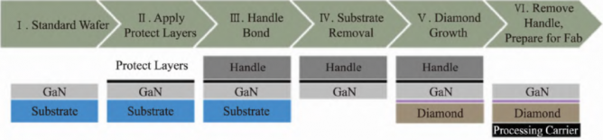 金剛石具有優(yōu)異的絕緣性和超高的熱導率,單晶金剛石在室溫下的導熱系數(shù)高達 2400 W/(m·K),多晶金剛石在室溫下的導熱系數(shù)接近 2000 W/(m·K),是 GaN 基器件的理想襯底材料。所以熱源與金剛石集成后,憑借金剛石的超高熱導率,熱源產生的熱量會迅速地橫向擴散在基板內,提升了熱源與外界的有效換熱面積,從而可以極大地提升系統(tǒng)的換熱能力。金剛石基 GaN 器件的散熱路徑如圖 1(b)所示。此外,為了進一步加強器件的熱管理性能,也有學者將嵌入式微流體冷卻技術的高換熱能力與金剛石的高導熱能力結合起來。帶微流體的金剛石基 GaN 器件的散熱路徑如圖 1(c)所示,在器件的金剛石襯底上加工微通道,將冷卻工質引入至近結區(qū),以期實現(xiàn)更強的熱管理能力。對于金剛石基 GaN 技術的研究,按照研究思路大致分為以下 2 種途徑:一是基于沉積生長工藝,在GaN 器件上生長金剛石材質或是在金剛石上外延生長 GaN 器件層,以完成熱擴散層的集成;二是基于鍵合工藝,為了降低器件的界面熱阻,在低溫甚至是室溫下,將化學氣相沉積(CVD)生長的金剛石基板與GaN 器件層進行鍵合。2014 年,美國 Element 公司 (原 Group4 Labs)的BABIC 等開發(fā)了直接在外延生長的 GaN 基片上生長金剛石的工藝。首先在高阻 Si 襯底上生長Al GaN/GaN 的器件層,由于 GaN 上直接生長金剛石通常需要富氫環(huán)境(氫的體積分數(shù)為 95%~99%)和較高的生長溫度(700℃以上),此時 GaN 晶圓受到刻蝕,導致在 GaN-金剛石界面形成空洞和缺陷,進而增加了額外的熱阻。因此,需要一層介質來保護 GaN 外延層。隨后晶圓被倒裝安裝在臨時處理片上。之后再去除晶圓下方的 Si 和一些氮化物過渡層,并在暴露的 GaN緩沖層上沉積 50 nm 的介電層,使用熱燈絲化學氣相沉積(HFCVD)工藝在其上方生長 100 μm 的金剛石,最后從臨時處理片上取下金剛石并去除氮化硅保護層,使用襯底移除的工藝在外延 GaN 上直接生長金剛石的具體流程如圖 2 所示。