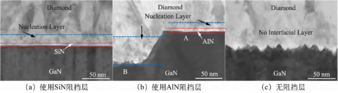 圖2 使用襯底移除工藝在外延 GaN 上直接生長金剛石的流程該方法的關鍵在于金剛石的生長質量,多晶金剛石通常以晶柱的方式生長,在成核的表面迅速形成具有較小尺寸的晶粒。由于聲子在晶界處的散射和吸收,晶核形成過程中的大量晶界無序或錯亂的現(xiàn)象將對導熱性能產生較大的影響。因此,在界面熱阻沒有公認理論模型的情況下,必須通過實驗來測定不同生長工藝生長的金剛石產生的界面熱阻值。2017 年,英國 Bristol 大學設備熱成像與可靠性中心(CDTR)的 ZHOU 等比較了 GaN/SiC 直接生長與分別使用 SiN 或 AlN 作為 GaN 和金剛石的阻擋層3 種加工手段產生的界面熱阻,結果如圖 3 所示。