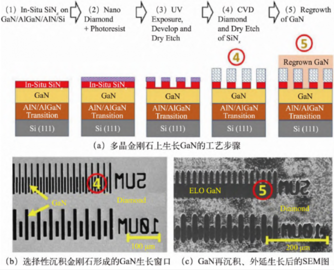 圖3 阻擋層分別為 SiN、AlN 以及無阻擋層的界面熱阻比較以SiC 襯底上 500 nm 厚的 GaN 層為襯底,在 GaN 上生長了 5 nm 厚的非晶態(tài) SiN 或 AlN 阻擋層,在氫氣、氬氣、甲烷(體積分數(shù)為 0.1%~1%)的氣體氛圍中,利用微波等離子體化學氣相沉積技術(MPCVD),在微波輸入功率為 2000~2500 W 的工況下,淀積了厚度約為 1 μm 的多晶金剛石層。由于金剛石 /SiN/GaN 樣品產生了粗糙度極低的光滑界面,該金剛石基 GaN 具有已知報道的最低界面熱阻(TBR),約為 6.5 m2·K/GW。金剛石基 GaN 結構的制備還可以通過在金剛石基底上生長 GaN 來實現(xiàn)。用于加工器件的 GaN 層需要具有足夠高的二維電子氣(2DEG)遷移率和面載流子密度,這要求外延生長的 GaN 層需要具有良好的晶體取向一致性、低的位錯密度、盡可能少且小的表面裂紋以及較低的表面粗糙度。但是 GaN和金剛石的固有材料屬性使外延生長工藝難度較大:①金剛石與 GaN 有較大的晶格失配度(約 13%),這容易導致外延生長的 GaN 具有較大的位錯密度,晶體質量不佳;②2 種材料間的熱膨脹系數(shù)(CTE)差別較大,金剛石的 CTE 約為 0.8×10-6 K-1,而 GaN 不同方向的 CTE αa=5.6×10-6 K-1,αc=3.2×10-6 K-1,CTE 失配將產生嚴重的界面熱應力,可能導致 GaN 外延層的開裂、脫落;③當外延生長襯底為多晶金剛石時,GaN 與襯底之間沒有固定的晶格外延關系,外延生長會產生多個不同取向的晶疇,得到連續(xù)的 GaN 晶體會更困難。綜上所述,由于材料的特點,相比在 GaN 基底上生長金剛石,在金剛石基底上生長高質量 GaN 需要克服更多的困難,因此近年來的相關研究較少。早在 2003 年,HAGEMAN 等使用金屬有機物化學氣相沉積工藝(MOCVD),利用 AlN 作為形核層,在(110)方向的單晶金剛石上沉積初始 GaN 層后,再通過氫化物氣相外延工藝(HVPE)使 GaN 晶粒長大,從而在金剛石上生長了厚度超過 100 μm 的多晶 GaN層。這是最早關于金剛石上外延生長 GaN 的報道。后續(xù)十幾年,各種在金剛石上外延生長 GaN 的方法被不斷探索,為了避免 GaN 晶體的高度無序,保證 GaN 層的電學性能,通常需要一個 Si (111)層或 SixN 層作為外延生長的介質層,但這種低熱導率的介質層也阻礙了熱量的傳遞,并且介質層的制備也增加了工藝的復雜度。2020 年,德克薩斯州立大學的 AHMED 等使用側向外延生長工藝(ELO)成功從圖形化的金剛石開口中外延生長出連續(xù)的 GaN 薄膜,實現(xiàn)金剛石基 GaN結構,其過程和結果如圖 4 所示。該課題組首先在 SiN上選擇性地沉積金剛石納米晶粒,使用刻蝕方法使SiN 開口以暴露出 GaN 層,利用該層 GaN 的晶體結構,使用 MOCVD 工藝在其上方外延生長成質量良好的器件層。