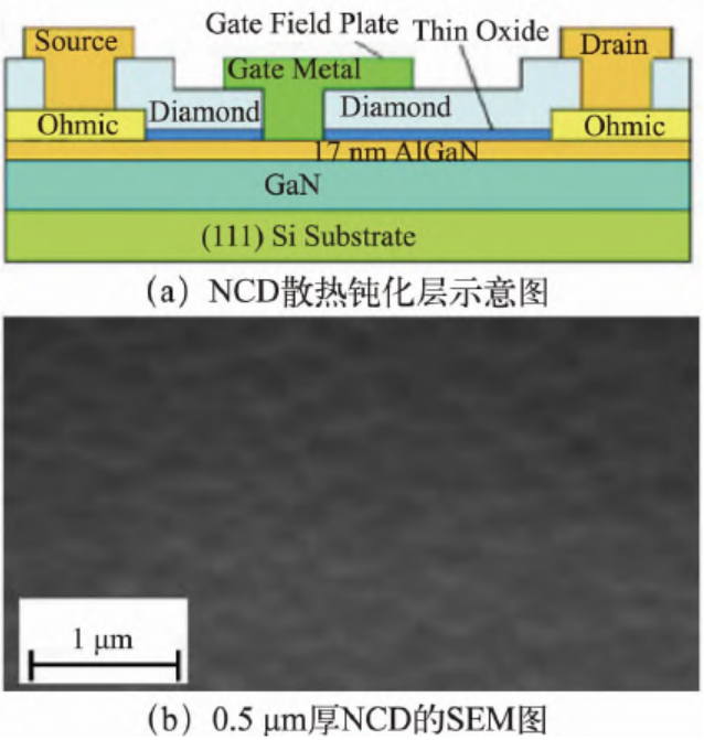 金剛石材料不僅可以作為襯底材料降低 GaN 器件的結溫,由于其具有優(yōu)良的絕緣特性,多晶金剛石還可以作為散熱鈍化層直接淀積在器件頂部以增強熱點頂部的熱擴散,同樣可以起到增大換熱面積的作用。2012 年,美國海軍研究實驗室(NRL)的 TADJER等成功在 GaN 基 HEMT 頂部制備了高熱導率納米金剛石薄膜(NCD)以取代熱導率較低的 Si3N4鈍化層,器件結構如圖 6(a)所示。這種工藝首先需要使用等離子增強化學氣相沉積(PECVD)在器件表面制備50 nm 的 SiO2作為 NCD 的阻擋層,之后在 750℃下以 100 nm/h 的速度生長 0.5 μm 的 NCD,圖 6(b)為其SEM 圖。經過實測,NCD 散熱鈍化層的散熱性能比SiN 鈍化層更好,使器件的工作溫度下降了 20%。