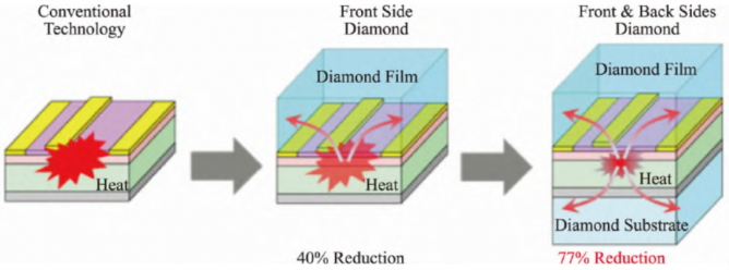 2019 年,日本富士通公司報道了一種在 GaN 基HEMT 器件表面生長高散熱性能的金剛石薄膜的方法,生長的金剛石在特定晶相上具有微米尺度的晶粒。該團隊在制備好的金剛石散熱鈍化層器件的背面鍵合了高導熱金剛石散熱襯底,制作了金剛石-GaN-金剛石的雙層金剛石散熱結構,傳統(tǒng)封裝結構、單層金剛石散熱鈍化層結構與雙層金剛石散熱結構對比如圖 7 所示。經過測試,這種雙層金剛石方案具有優(yōu)異的散熱性能,熱點結溫較傳統(tǒng)封裝下降了 77%。