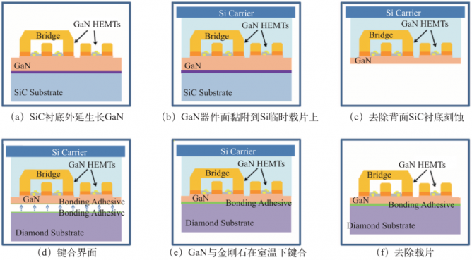 圖7 傳統(tǒng)封裝結構、單層金剛石散熱鈍化層結構與雙層金剛石散熱結構對比盡管實驗結果已證明使用生長淀積制備金剛石基 GaN 器件的方法可行,但由于生長工藝多是在高溫環(huán)境中進行,容易產生熱應力失配等問題,熱應力失配會導致器件在材料相交界面處有較大的晶格失配,引起較大的界面熱阻,從而導致金剛石喪失其超高熱導率的優(yōu)勢。且高溫工藝下產生的翹曲會增加器件的后續(xù)工藝加工難度,影響工藝質量和生產良率。所以近年來有大量研究聚焦于 GaN 與金剛石基板鍵合集成技術,并為了減小高溫鍵合工藝中熱應力的影響,著重開發(fā)了低溫鍵合技術。1990 年,麻省理工學院林肯實驗室的 LIAU 等使用了熱鍵合的方法成功鍵合了厘米級大小的Ⅲ-Ⅴ族半導體材料晶圓,并產生了具有正常二極管特性的PN 結,證明了化合物半導體材料鍵合的可行性。之后GaN 在高阻 Si 襯底上的制備工藝日漸成熟,由于 Si襯底易去除的特性,可以獲得質量更好的 GaN 晶體用于鍵合。鍵合工藝的優(yōu)勢之一是鍵合前的材料都可以使用最適合的方式進行生長淀積,鍵合材料的質量得到了保證,可以最大程度保證金剛石的高熱導率和 GaN材料優(yōu)異的電學性能,因此鍵合成為了制備金剛石基GaN 器件的重要發(fā)展方向。但是由于金剛石和 GaN 之間熱膨脹系數(shù)的不同,在高溫下鍵合產生的熱失配較大,會導致嚴重的界面熱阻和可靠性問題,因此近年來許多研究致力于低溫下鍵合工藝的開發(fā)與探索。