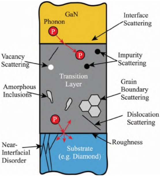 金剛石的集成對于高功率 HEMT 器件的散熱能力提升十分重要,但是金剛石與 GaN 之間較大的晶格失配使得金剛石較傳統(tǒng)的 Si C 基底來說更難集成。集成質量不佳會導致材料分界面處產生較大的界面熱阻,過大的界面熱阻甚至會抵消金剛石的高導熱優(yōu)勢,因此如何提高集成質量、減小界面熱阻成為了金剛石集成工藝開發(fā)的重要研究方向。GaN-金剛石界面的界面熱阻產生機理如圖 10 所示,主要包括 3 種微觀機制:一是 GaN 和襯底過渡層之間的聲子散射;二是過渡層內生成的點缺陷、位錯和其他缺陷導致的聲子散射;三是 GaN 和襯底中近界面的聲子無序散射。