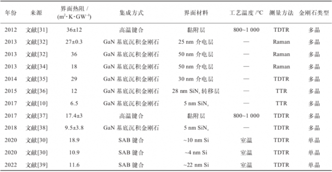 降低金剛石-GaN 界面熱阻是集成方法優(yōu)化迭代的重要方向,近年來由于逐漸開發(fā)的低溫工藝和轉移生長工藝,金剛石-GaN 的界面熱阻有了巨大的改善,表 1 展示了近年來文獻報道的金剛石基 GaN 器件的界面熱阻,可以看到,隨著集成工藝手段的不斷提升,界面熱阻得到了巨大的改善。通過表面活化的低溫鍵合、添加納米黏附層等方法所制備的金剛石-GaN 器件有著相對較小的界面熱阻,并可以實現(xiàn)晶圓級別的加工。但是金剛石-GaN 器件的集成機理有待進一步探索,針對界面處的復雜應力問題、微觀失效機理等方面的研究亟需新的發(fā)現(xiàn)和突破。