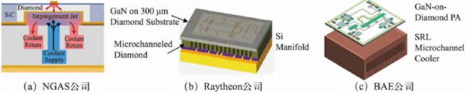 DARPA 從 2012 年開始啟動芯片內/芯片間增強冷卻(ICECool)研究計劃,通過嵌入冷卻液介質通道的方式在金剛石基板內進行強制對流散熱,從而實現(xiàn)更高的散熱能力,即采用金剛石基 GaN 的嵌入式微流體冷卻技術將熱量轉移到冷卻液中帶走。