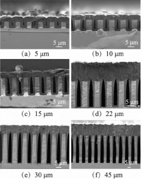 圖12 在 Si 模具上沉積金剛石工藝制備的不同溝槽深度的微通道結構