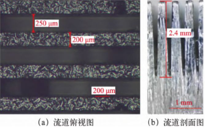 2019 年,西安交通大學的王宏興教授課題組在HPHT 法制備的金剛石基板上使用水導激光技術加工出寬度僅為 55 μm 的金剛石溝槽,然后通過 MPCVD工藝讓金剛石流道頂部外延生長厚度約 300 μm 的金剛石,從而形成封閉流道。水導激光加工后外延生長的金剛石微流道如圖 14 所示。