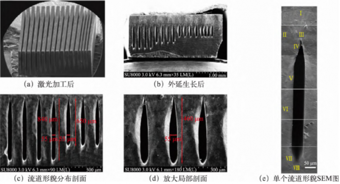 2020 年,北京航空航天大學的 YANG 等采用直流電弧等離子體噴射 CVD 法獲得多晶金剛石薄膜,并將該薄膜加工成 45 mm 長、22.5 mm 寬、3 mm 厚的金剛石襯底,使用飛秒激光燒蝕技術在金剛石薄膜上制備了 37 個平行三角形微通道,通道長度為 45 mm,水力直徑為 280 μm,每個通道寬度為 300 μm,高度為1500 μm(深寬比為 5)。在高熱流密度(473.9~1000.4 W/cm2)條件下,研究了氨為冷卻介質時微通道內流動沸騰的換熱特性,散熱器的散熱功率密度達1000.4 W/cm2。2022 年,該團隊將飛秒激光燒蝕方法應用于多點熱源的太陽能光伏電池散熱系統(tǒng)中的散熱微流道,在 351.5 W/cm2的熱流密度下,控制熱源表面溫度在 65.9℃以下,且多點熱源之間溫差可以控制在 1.4℃以內。飛秒激光燒蝕金剛石微流道掃描電鏡照片如圖 13 所示。