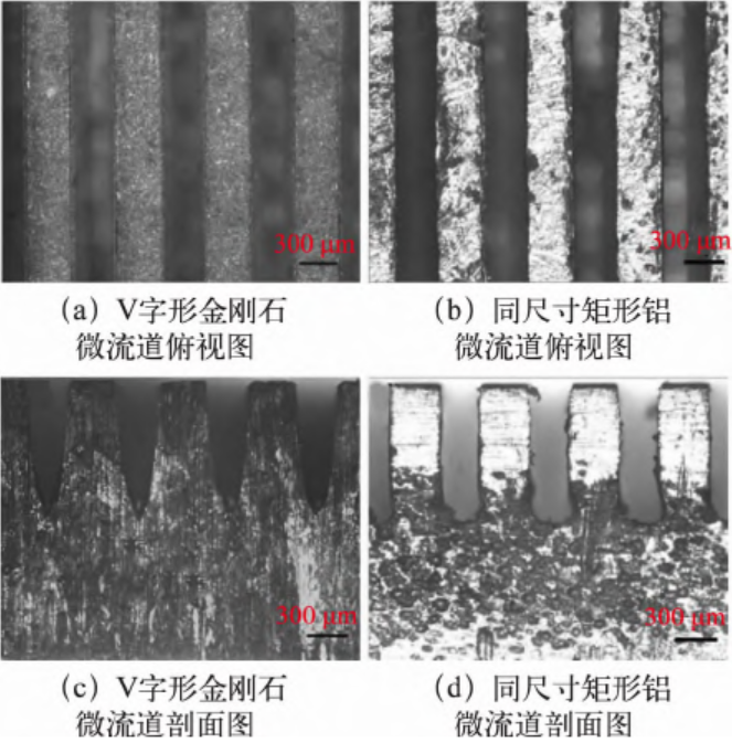 該方法制備的金剛石流道深寬比可超過 10,且深度可達 800 μm。該研究利用高于常規(guī)激光加工分辨率的水導激光加工實現(xiàn)了更小寬度的金剛石流道制備,但每條溝槽的加工需要激光掃描 10~20 次,激光束移動速度為 4 mm/s,在進行大尺寸散熱結構批量加工時效率低且成本高。2020 年,北京科技大學的 QI 等采用 100 k W 直流電弧噴射等離子體化學氣相沉積(DC Arc Plasma Jet CVD) 系統(tǒng)制備了 4~6 mm 的超厚金剛石膜。以CH4、H2、Ar 為反應氣體,在 880℃襯底溫度下開始進行沉積,通過調控甲烷氣體通量實現(xiàn)晶粒間隙填補、抑制大尺寸柱狀晶異常生長的效果。使用激光在超厚金剛石膜表面加工出 1000 μm 深、330 μm 寬(深寬比為3) 的 V 字形微流道,在熱源熱流密度為 40~120 W/cm2且控制熱源工作溫度為 100℃的情況下,測得對流傳熱系數(shù)為 5637.10~11 447.20 W/ (m2·K),比相同幾何形狀的鋁微流道高 37%~73%。金剛石微流道與商用鋁微流道的結構對比如圖 15 所示。