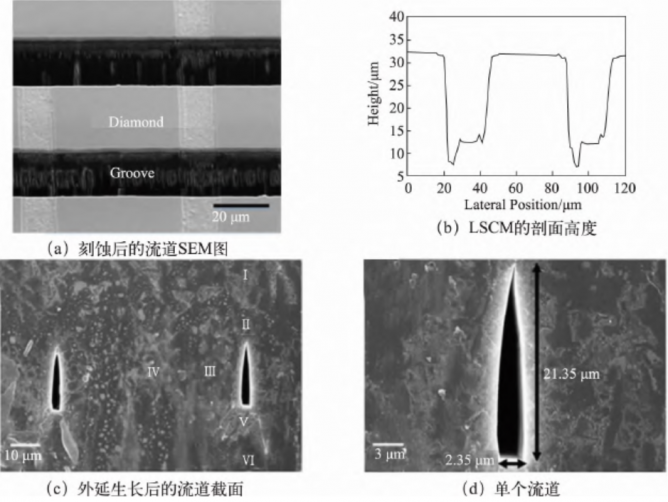目前通常采用激光燒蝕來實現(xiàn)金剛石的加工,例如切割金剛石板或金剛石刀具,以及制造微米尺度的透鏡、光柵、微通道等圖形結構。而隨著金剛石生長技術的進步,高質量的金剛石襯底得以商業(yè)化供應,其中市售的單晶襯底通常規(guī)格可達到幾平方毫米,而多晶襯底則可達到 4 英寸甚至 6 英寸晶圓規(guī)格。加工大尺寸金剛石襯底的需求對加工的速率、并行性、精細度提出了更高的要求,屬于串行加工方法的激光加工逐漸顯露其局限性,而反應等離子體刻蝕金剛石的微加工技術逐漸成為被廣泛研究的課題。刻蝕技術的優(yōu)點在于綜合利用了光刻的高分辨率、刻蝕加工的并行性以及反應等離子體刻蝕后表面的低粗糙度等,該工藝方法目前在金剛石光學器件微加工領域已有較廣泛的發(fā)展。而金剛石微流道的加工制備對刻蝕深度以及刻蝕深寬比有著較高的要求,在深刻蝕的情況下,負載效應導致的刻蝕效率下降也應被考慮。2018 年,西安交通大學的王宏興教授課題組結合刻蝕工藝與橫向外延生長工藝加工了金剛石微流道。該研究通過磁控濺射的方式在金剛石表面制備了 6 μm 厚的 Al 膜作為刻蝕硬掩模,在 ICP RIE 刻蝕工藝過程中,使用 O2和 Ar 混合的刻蝕氣體配方,成功在金剛石表面加工出凹槽。在此基礎上,通過MPCVD工藝使金剛石橫向外延生長,最終制備得到封閉的金剛石流道。使用 ICP RIE 制備的金剛石微流道溝槽與外延生長后的微流道結構如圖 16 所示。