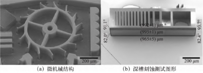 圖16 使用 ICP RIE 制備的金剛石微流道溝槽與外延生長后的微流道結構刻蝕后形成的凹槽結構深寬比約為 1∶1,寬度及深度都約為 20 μm;經過橫向外延生長的封閉流道結構深寬比提高到了 10∶1,但流道寬度由于金剛石橫向生長而縮小到約 2 μm,該尺寸對用于散熱的微流道來說過于狹窄,會導致較大的流體壓降。2018 年,悉尼大學的 TOROS 等僅通過氧等離子 ICP RIE 刻蝕制備的較大深度的金剛石微機械結構如圖 17(a)所示。他們成功制備并釋放了刻蝕深度達150 μm 的微結構,且其中槽結構深寬比可達 8∶1,側壁較平整、垂直,深槽刻蝕測試圖形如圖 17(b)所示,這一研究為金剛石微流道的刻蝕加工提供了思路。