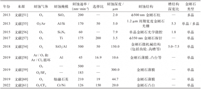 也有學者將研究聚焦在金剛石刻蝕工藝的控制上,2018 年,美國哈佛大學的 XIE 等利用氧等離子體對單晶金剛石有晶向選擇性刻蝕的特點,提出了一種通過調控刻蝕過程中的射頻偏置功率大小從而控制刻蝕暴露出的金剛石晶面的方法。研究結果表明,不同大小的偏置功率可以準確對應不同的刻蝕面角度,且當偏置功率高于 80 W 時,晶向選擇性刻蝕現(xiàn)象基本消失,刻蝕得到的側壁基本垂直。近年來報道的 ICP RIE 刻蝕金剛石的情況如表 2所示,雖然沒有直接應用于散熱微流道加工的研究,但金剛石刻蝕的高速率、高選擇比是各項工作的共同追求,其中也包含對金剛石深刻蝕、精細結構刻蝕的研究,證明了利用刻蝕方式加工微流道具有巨大的潛力。 表2 近年來報道的 ICP RIE 刻蝕金剛石的情況