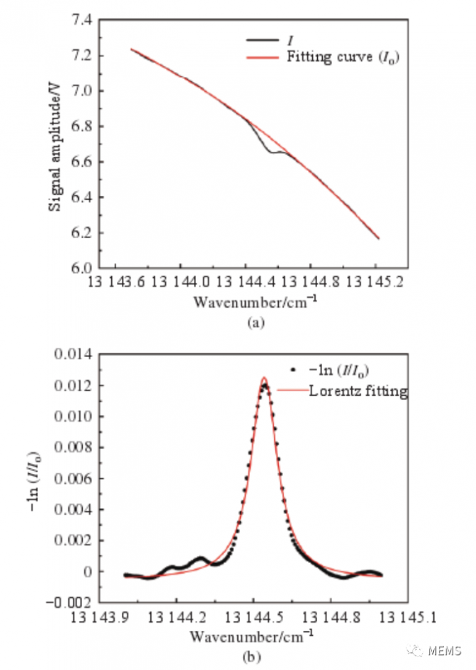 TDLAS技術(shù)主要分為直接吸收光譜技術(shù)(Direct Absorption,DA)和波長調(diào)制光譜技術(shù)(Wavelength Modulation Spectroscopy,WMS)。直接吸收光譜技術(shù)通過測量光譜吸收率信號,常用于氣體濃度的反演。其工作原理為通過改變激光器的工作溫度和電流,控制其輸出波長范圍,從而獲得一段有完整吸收峰的吸收譜線。在此基礎(chǔ)上,通過計算吸光度曲線在頻域上的積分值,結(jié)合氣體濃度計算式可直接得到氣體濃度。