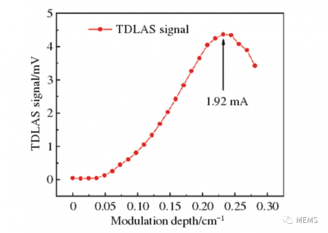 TDLAS系統(tǒng)信號幅值隨調(diào)制深度的變化關(guān)系