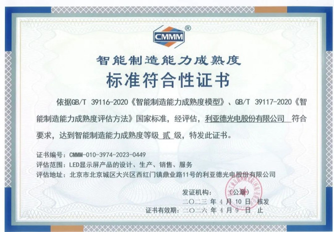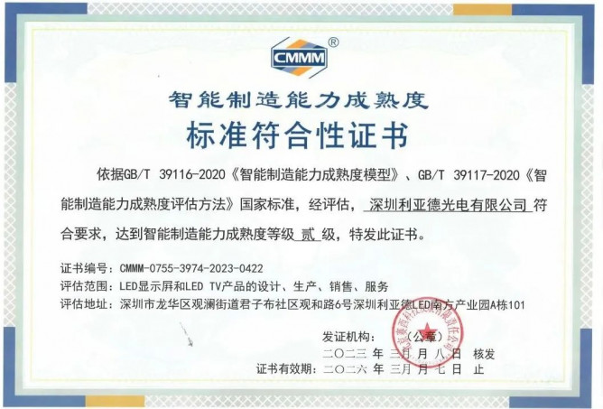 近日,利亞德光電、深圳利亞德同時通過智能制造能力成熟度二級評估復(fù)核。