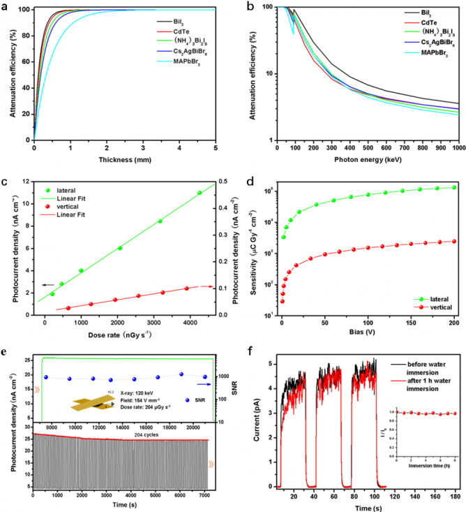圖5. 范德華異質(zhì)結(jié)構(gòu)碘化鉍的X-射線吸收,靈敏度及穩(wěn)定性