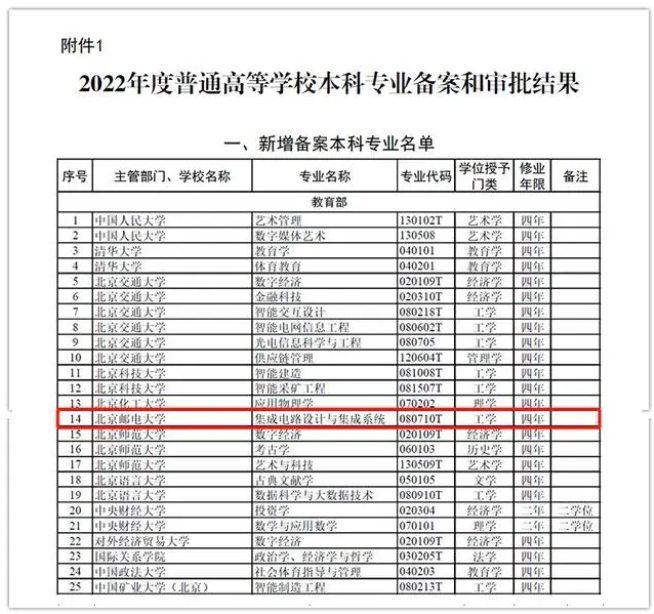 近日,教育部公布了2022年度普通高等學(xué)校本科專(zhuān)業(yè)備案和審批結(jié)果,北京郵電大學(xué)獲批新增“集成電路設(shè)計(jì)與集成系統(tǒng)”本科專(zhuān)業(yè)(專(zhuān)業(yè)代碼:080710T)。
