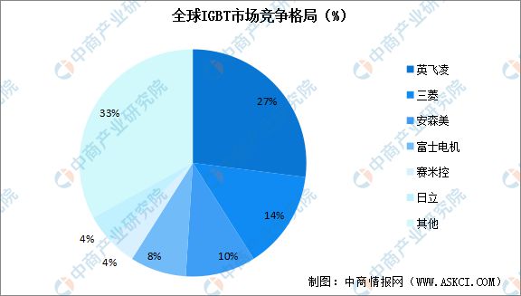 我國IGBT產(chǎn)業(yè)起步較晚,市場主要被國外企業(yè)壟斷。數(shù)據(jù)顯示,行業(yè)前三名企業(yè)的市場份額合計達51%。其中英飛凌占比最多,達27%;三菱排名第二,占比14%;安森美占比10%,位居第三。本土企業(yè)中,士蘭微在全球IGBT單管及IPM市占率達到3.5%、2.2%,均位列全球第八;斯達半導(dǎo)在全球IGBT模塊市占率達3.0%,位列全球第六。