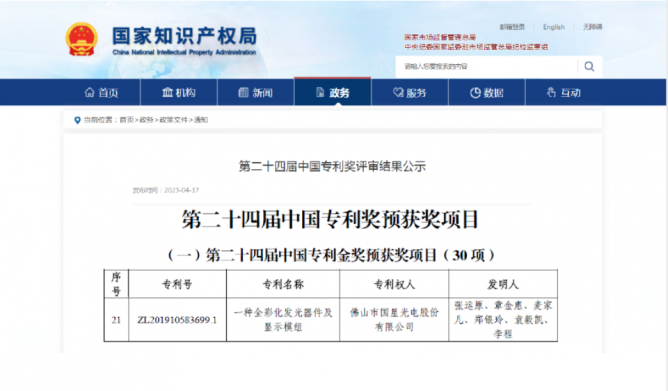近日,第二十四屆中國(guó)專(zhuān)利獎(jiǎng)評(píng)審結(jié)果結(jié)束公示,國(guó)星光電憑借發(fā)明專(zhuān)利“一種全彩化發(fā)光器件及顯示模組”(專(zhuān)利號(hào):ZL201910583699.1)喜獲中國(guó)專(zhuān)利金獎(jiǎng),實(shí)現(xiàn)了公司科技創(chuàng)新工作的歷史性突破。