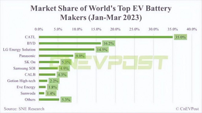 中國寧德時代以35%的市占率排名第一,比亞迪以16.2%名列第二。兩家公司首季裝車量同比分增35.9%和115.5%,為46.6和21.5吉瓦時。
