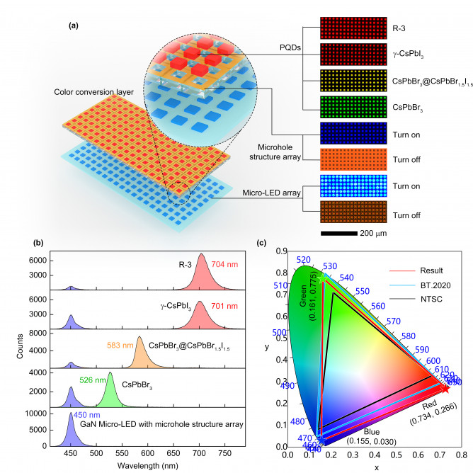 在將紅光量子點(diǎn)最佳激發(fā)波長(zhǎng)調(diào)節(jié)至藍(lán)光區(qū)域后,研究人員將該雙組分量子點(diǎn)應(yīng)用于藍(lán)光Micro-LED色轉(zhuǎn)換層中。借助玻璃微孔陣列作為載體,沉積出的量子點(diǎn)陣列與Micro-LED陣列相對(duì)應(yīng),實(shí)現(xiàn)了極佳的色轉(zhuǎn)換性能,顯示色域可達(dá)到135.9%的NTSC標(biāo)準(zhǔn)。
