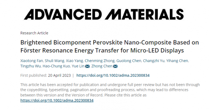 近日,廈門大學(xué)電子科學(xué)與技術(shù)學(xué)院半導(dǎo)體照明實(shí)驗(yàn)室在Micro-LED全彩顯示技術(shù)方面取得突破性進(jìn)展。這一成果以“Brightened bicomponent perovskite nanocomposite based on F?rster resonance energy transfer for micro-LED displays”為題發(fā)表在Advanced Materials(《先進(jìn)材料》)上。