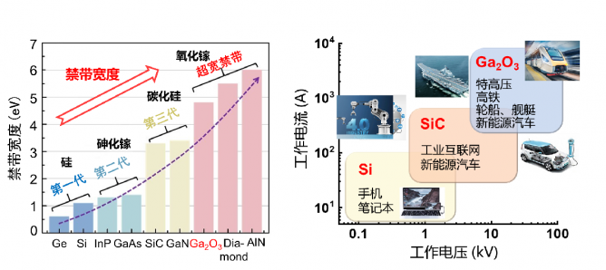 近年來(lái),氧化鎵(Ga2O3)半導(dǎo)體受到世界各國(guó)科研和產(chǎn)業(yè)界的普遍關(guān)注。氧化鎵具有4.9 eV的超寬禁帶,高于第三代半導(dǎo)體碳化硅(SiC)的3.2 eV、氮化鎵(GaN)的3.39 eV。更寬的禁帶寬度意味著電子需要更多的能量從價(jià)帶躍遷到導(dǎo)帶,因此氧化鎵具有耐高壓(極強(qiáng)的臨界場(chǎng)強(qiáng))、高效率(更低導(dǎo)通電阻)、大功率、抗輻照等特性。在制造工藝方面,氧化鎵晶體可以通過(guò)成熟的熔融法生長(zhǎng),相對(duì)第三代半導(dǎo)體SiC、GaN,可大幅度降低生產(chǎn)成本。基于氧化鎵半導(dǎo)體的功率電子器件可在新能源汽車、充電樁、軌道交通、電機(jī)控制等領(lǐng)域具有潛在應(yīng)用。基于氧化鎵的深紫外光電探測(cè)器則在導(dǎo)彈預(yù)警、高壓電網(wǎng)電暈檢測(cè)、臭氧空洞監(jiān)測(cè)等領(lǐng)域展現(xiàn)出重要的潛力。因此,氧化鎵也和金剛石、氮化鋁(AlN)等超寬禁帶半導(dǎo)體被稱為第四代半導(dǎo)體。