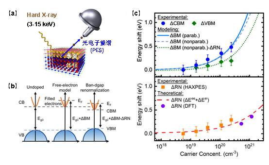 圖2.(a)同步輻射光源的硬X-射線光電子能譜。(b)帶隙重整化效應(yīng)能帶結(jié)構(gòu)示意圖。(c)基于拋物線和非拋物線模型載流子統(tǒng)計(jì)數(shù)據(jù)得出的Burstein-Moss移動(dòng)(?BM)、帶隙重整化效應(yīng)(?RN)和由HAXPES測(cè)得的帶隙重整化效應(yīng)[?RN (HAXPES)]、DFT計(jì)算值[?RN (DFT)]與載流子濃度的關(guān)系。