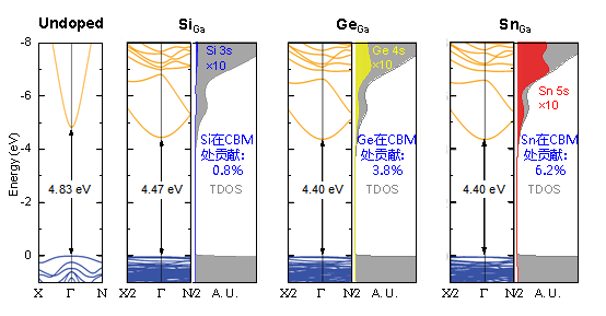 圖3. DFT計(jì)算得到的未摻雜及不同IV族(Si、Ge、Sn)摻雜Ga2O3的態(tài)密度圖