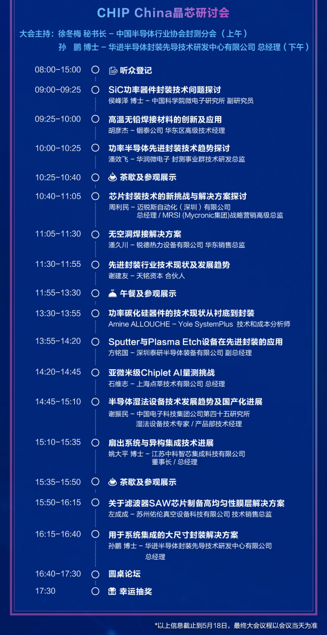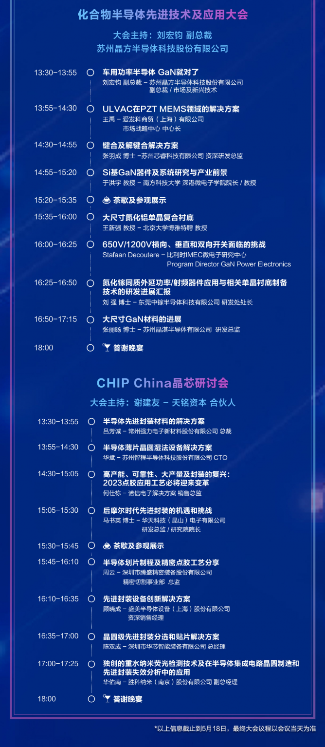 把握機遇,凝聚向前。雅時國際將于2023年5月23-24日,在蘇州組織舉辦主題為“2023-半導(dǎo)體先進(jìn)技術(shù)創(chuàng)新發(fā)展和機遇大會”。會議包括兩個專題:半導(dǎo)體制造與封裝、化合物半導(dǎo)體先進(jìn)技術(shù)及應(yīng)用。分別以“CHIP China晶芯研討會”和“化合物半導(dǎo)體先進(jìn)技術(shù)及應(yīng)用大會”兩場論壇的形式同時進(jìn)行。展開泛半導(dǎo)體產(chǎn)業(yè)高端對話,促進(jìn)參會者的交流信息與合作。