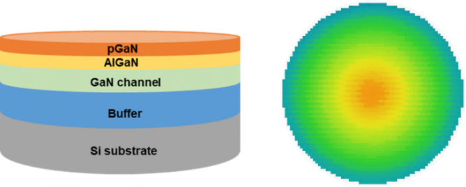 6吋硅基氮化鎵功率外延結(jié)構(gòu)示意圖及外延層厚度map圖