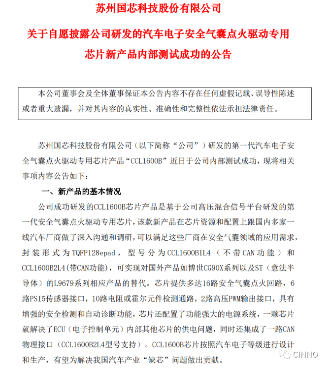 6 月 5 日消息,蘇州國(guó)芯科技股份有限公司發(fā)布公告表示,第一代汽車電子安全氣囊點(diǎn)火驅(qū)動(dòng)專用芯片產(chǎn)品“CCL1600B”近日于公司內(nèi)部測(cè)試成功,標(biāo)志著國(guó)內(nèi)首款汽車電子安全氣囊點(diǎn)火驅(qū)動(dòng)專用芯片研發(fā)成功。