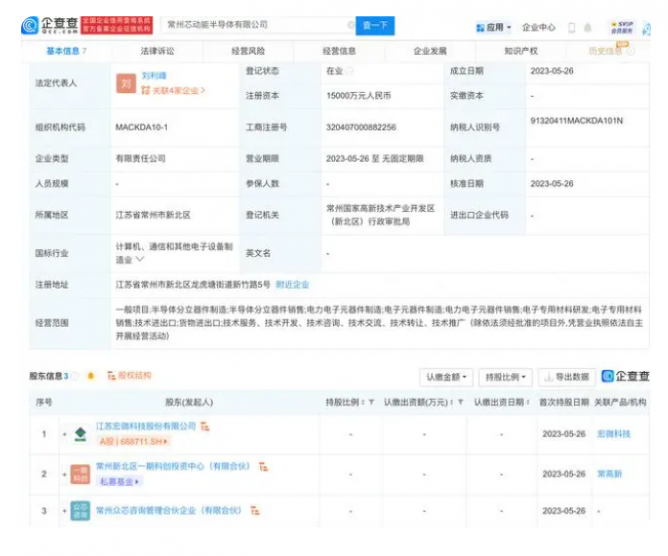 近日,常州芯動能半導(dǎo)體有限公司成立,法定代表人為劉利峰,注冊資本1.5億元人民幣,經(jīng)營范圍包含:半導(dǎo)體分立器件制造;半導(dǎo)體分立器件銷售;電力電子元器件制造;電子元器件制造等。企查查股權(quán)穿透顯示,該公司由宏微科技(688711)等共同持股。