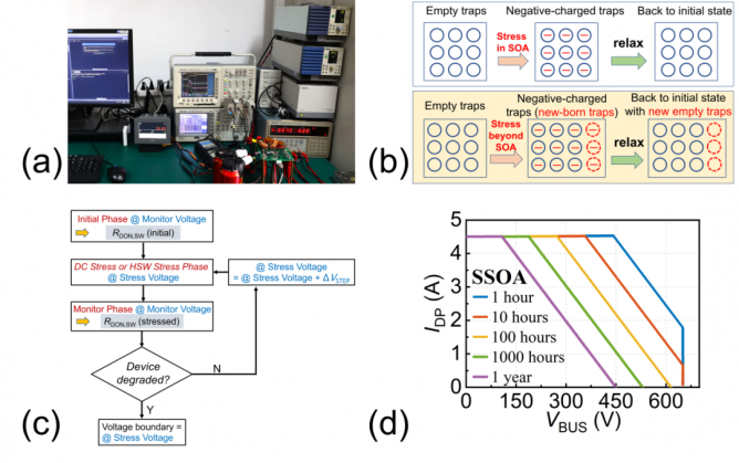 圖 (a) 團(tuán)隊(duì)自主搭建的自動(dòng)化硅基氮化鎵橫向功率器件動(dòng)態(tài)可靠性研究平臺(tái);(b) 基于器件是否生成新陷阱的角度區(qū)分硅基氮化鎵橫向功率器件的“可恢復(fù)退化”與“不可恢復(fù)退化;。(c) 提出一種檢測(cè)器件發(fā)生不可恢復(fù)退化的邊界的測(cè)試方法,以此測(cè)試序列表征器件開關(guān)安全工作區(qū);(d) 所測(cè)試的硅基氮化鎵橫向功率器件的開關(guān)安全工作區(qū)。