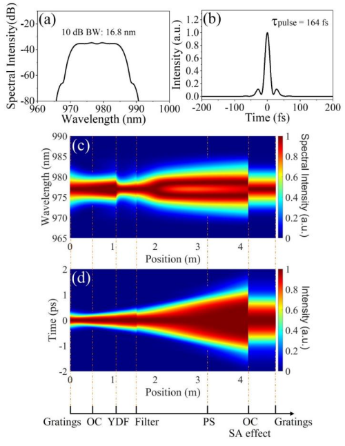 圖3. 數(shù)值模擬結(jié)果。(a、b)輸出色散管理孤子的光譜和時(shí)間特性;(c、d)腔內(nèi)脈沖的時(shí)頻演化過程。
