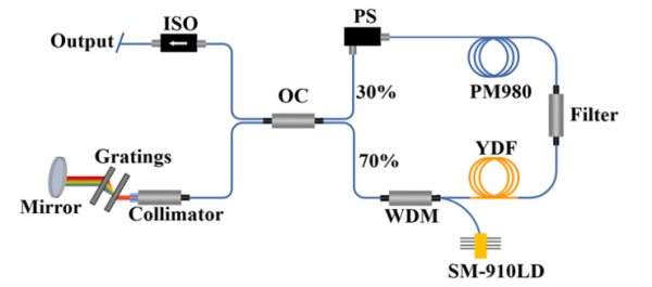 978 nm摻鐿飛秒鎖模光纖激光器因獨(dú)特的應(yīng)用價(jià)值而備受關(guān)注。然而,由于Yb3+在978 nm波長附近的吸收截面近似等于發(fā)射截面,為了在這個(gè)波長獲得高性能激光輸出,必須克服978 nm處的激光自吸收和1030 nm附近的放大自發(fā)輻射(ASE)等問題。此外,Yb3+在978 nm附近的增益帶寬相對較窄,這進(jìn)一步增加了在該波長下獲得飛秒激光脈沖的難度。因此,與1 μm以上的傳統(tǒng)摻鐿鎖模光纖激光器相比,實(shí)現(xiàn)這種978 nm的飛秒光纖激光器面臨著更大挑戰(zhàn)。
