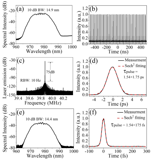 圖2. 978 nm九字腔光纖激光器輸出脈沖參數(shù)。(a)光譜,(b)脈沖序列,(c)射頻譜,(d)自相關(guān)信號,(e) 腔外壓縮后的頻譜和(f)自相關(guān)信號。