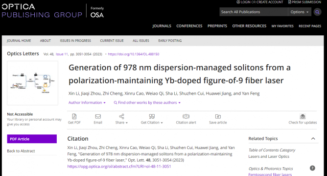 近期,中國科學(xué)院上海光學(xué)精密機(jī)械研究所高功率光纖激光技術(shù)實(shí)驗(yàn)室在特殊波長的飛秒超快光纖激光器研制方向取得重要進(jìn)展。該團(tuán)隊(duì)首次報(bào)道了一種基于色散管理、全保偏九字腔的978 nm飛秒摻鐿光纖激光器。相關(guān)研究成果以Generation of 978 nm dispersion-managed solitons from a polarization-maintaining Yb-doped figure-of-9 fiber laser為題,發(fā)表在《光學(xué)快報(bào)》(Optics Letters)上。