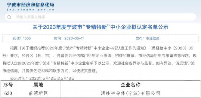 半導(dǎo)體產(chǎn)業(yè)網(wǎng)獲悉:近日,寧波市經(jīng)濟(jì)和信息化局發(fā)布了2023年度第一批寧波市“專精特新”中小企業(yè)名單,清純半導(dǎo)體成功入選。